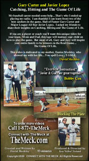 BEHIND THE DISH VIDEO INFO-- The video is 93 minutes of instruction and inspiration...The video was shot in my hometown, Dothan, AL on Feb 2nd 2000 ..Gary Carter flew in from Palm Beach, FL. and Javier left Atlanta at 4 am and drove 4 hrs to LA (Lower AL) and we shot the video in 1 day .. [ 9 hrs ].. JAVIER drove back to Atlanta that night and Gary flew home the next day .The video was produced by my friend Killer Noland.. It opens with the theme song...TIME ...a young boy throwing with his Dad at nite on the field.. Next we tell you about HALL OF FAMER GARY CARTER [ his life story ] and then all about ALL STAR JAVY LOPEZ and his life growing up in Puerto Rico. Then 65 mins of instruction on